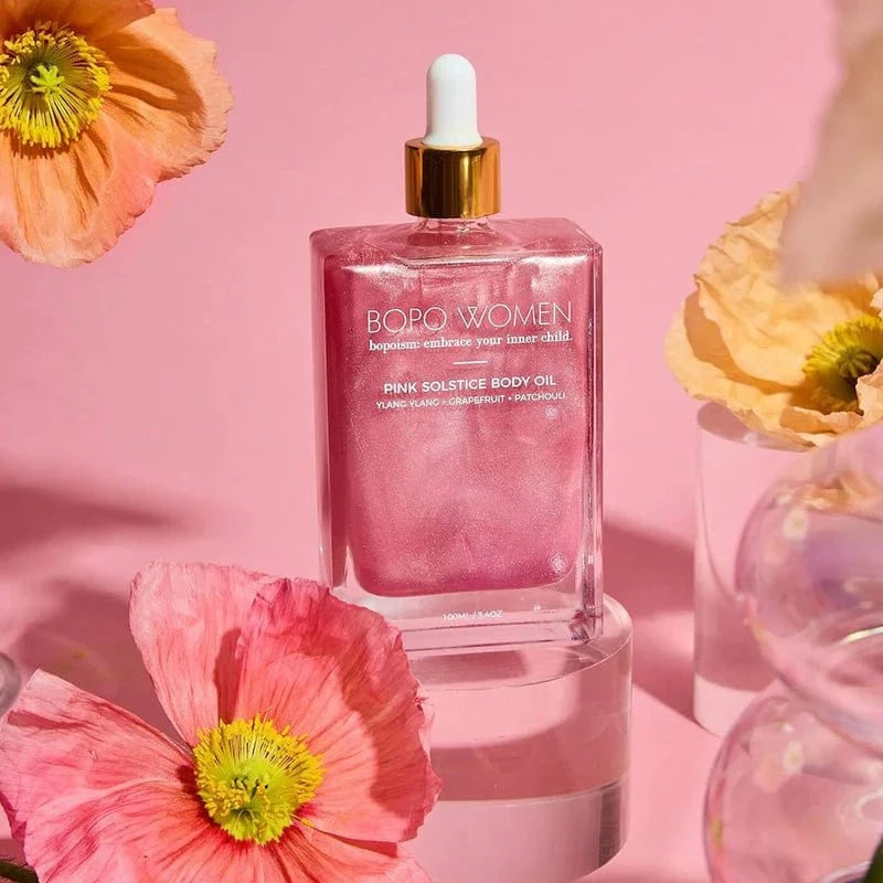 Summer Solstice Body Oil has been Barbie-fied and is now available in this gorgeous pink shimmer version. It keeps the same delicate floral scent that you know and love, with beautiful ylang ylang, grapefruit, mandarin and sweet orange essential oils. Deeply hydrates skin while leaving a pearlescent, illuminated soft glow that works well with all skin types. Can also be used in the bath. Make sure to regularly shake this product before use to get the most out of it's glittery magic.
