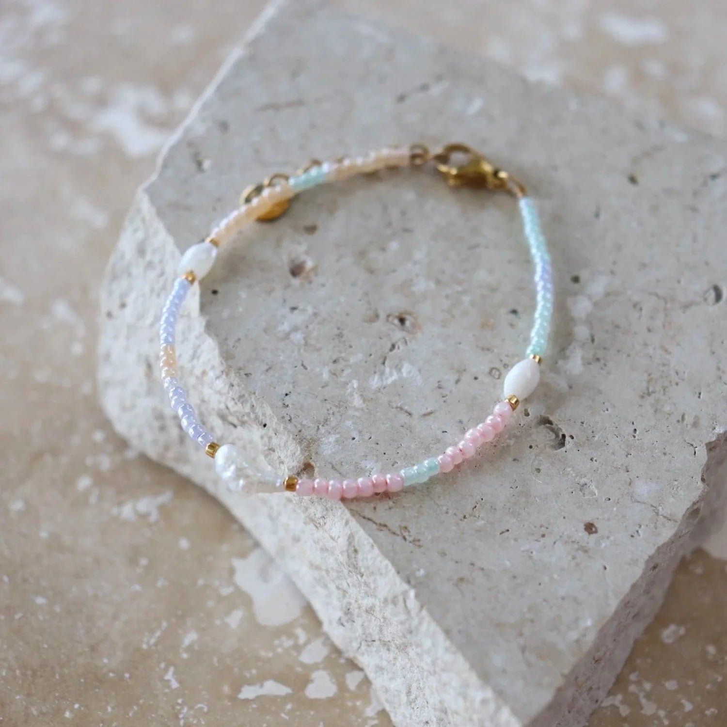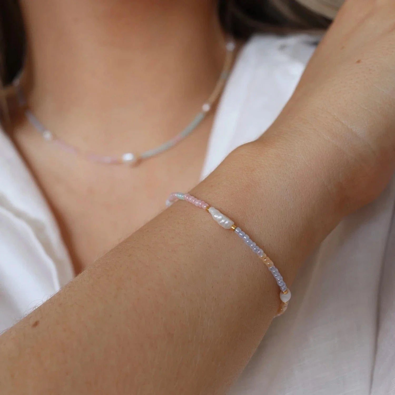 Dashes of mother of pearl or all pearl with Vintage Rice Pearl feature. This bracelet has been paired with a boho patchwork of 2mm glass seed beads. Make it a set!