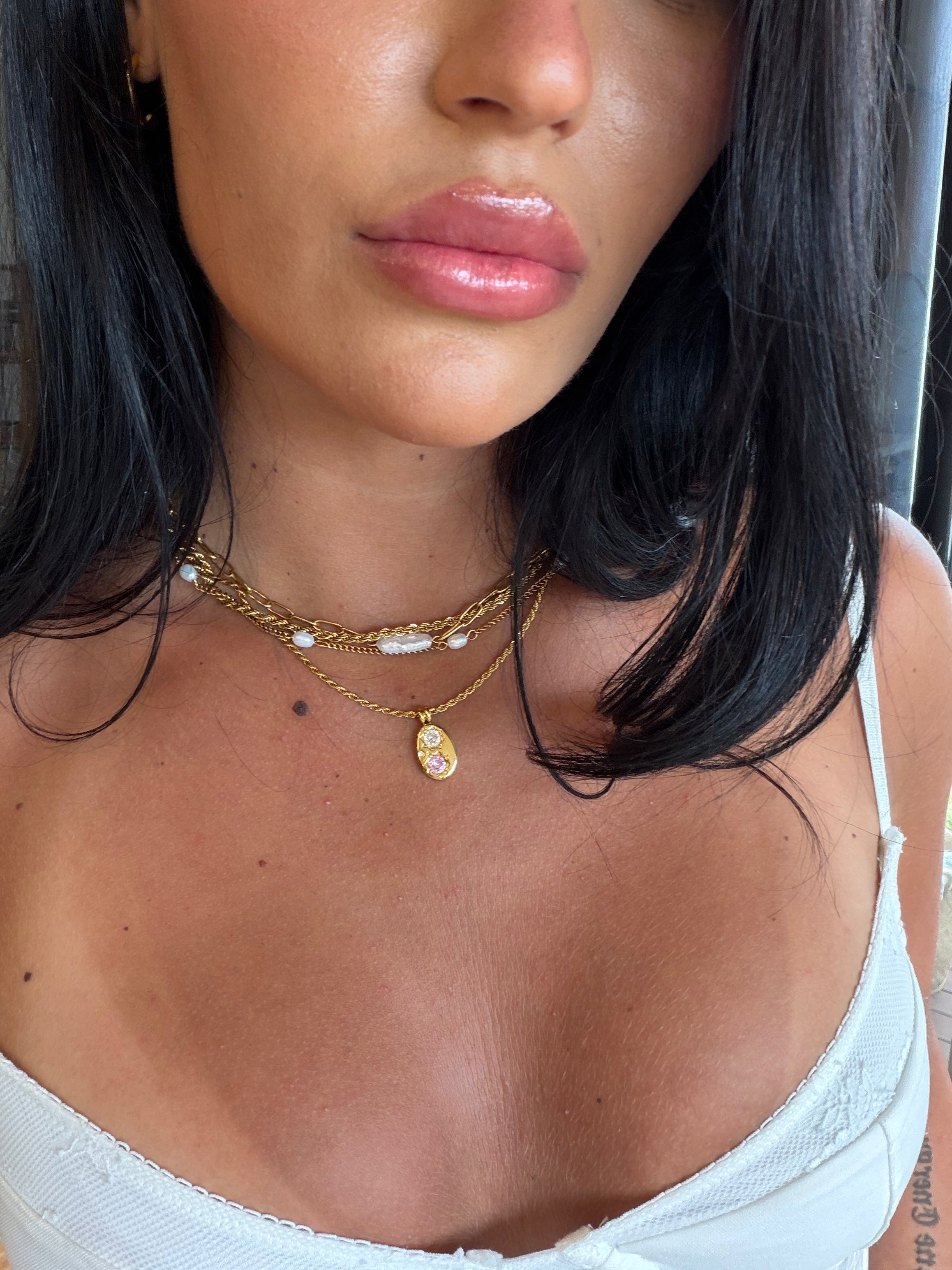Two sparkling zirconia stones in soft pink and crisp white dance together on a lustrous 18k gold-plated stainless steel chain. Built tough with a protective PVD coating, this beauty laughs in the face of water and tarnish—wear it everywhere, from beach days to rainy adventures. Timeless elegance that keeps up with your lifestyle.