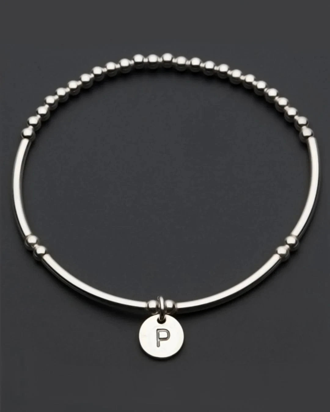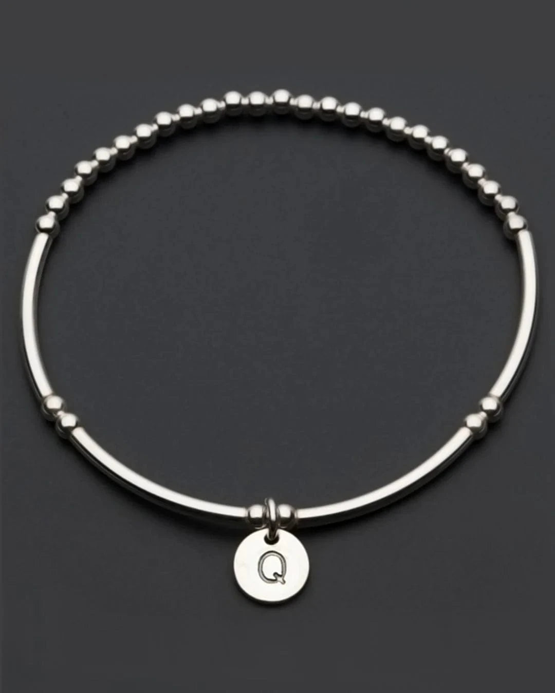 Silver beads and letter charm on stretch elastic with a 55mm Diameter