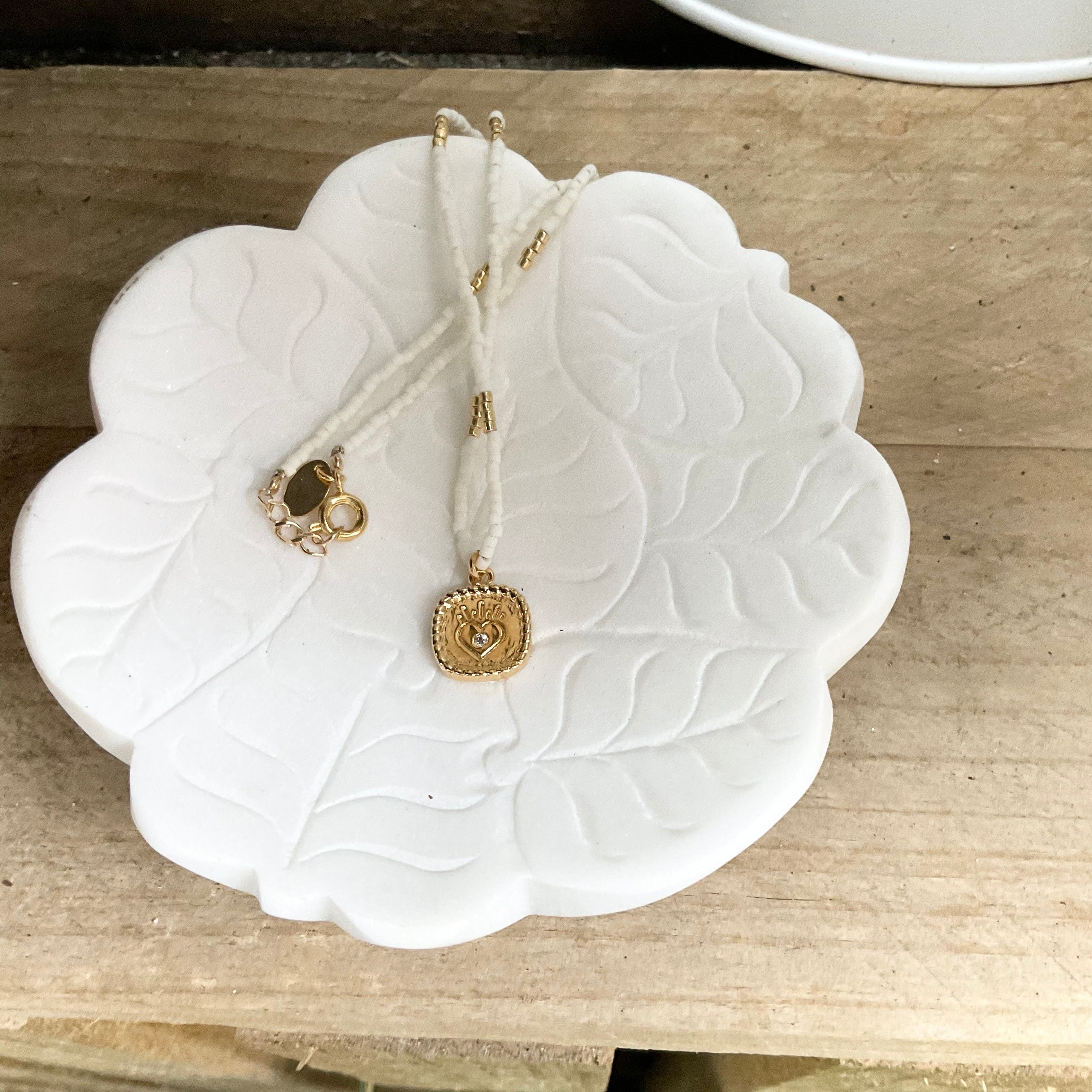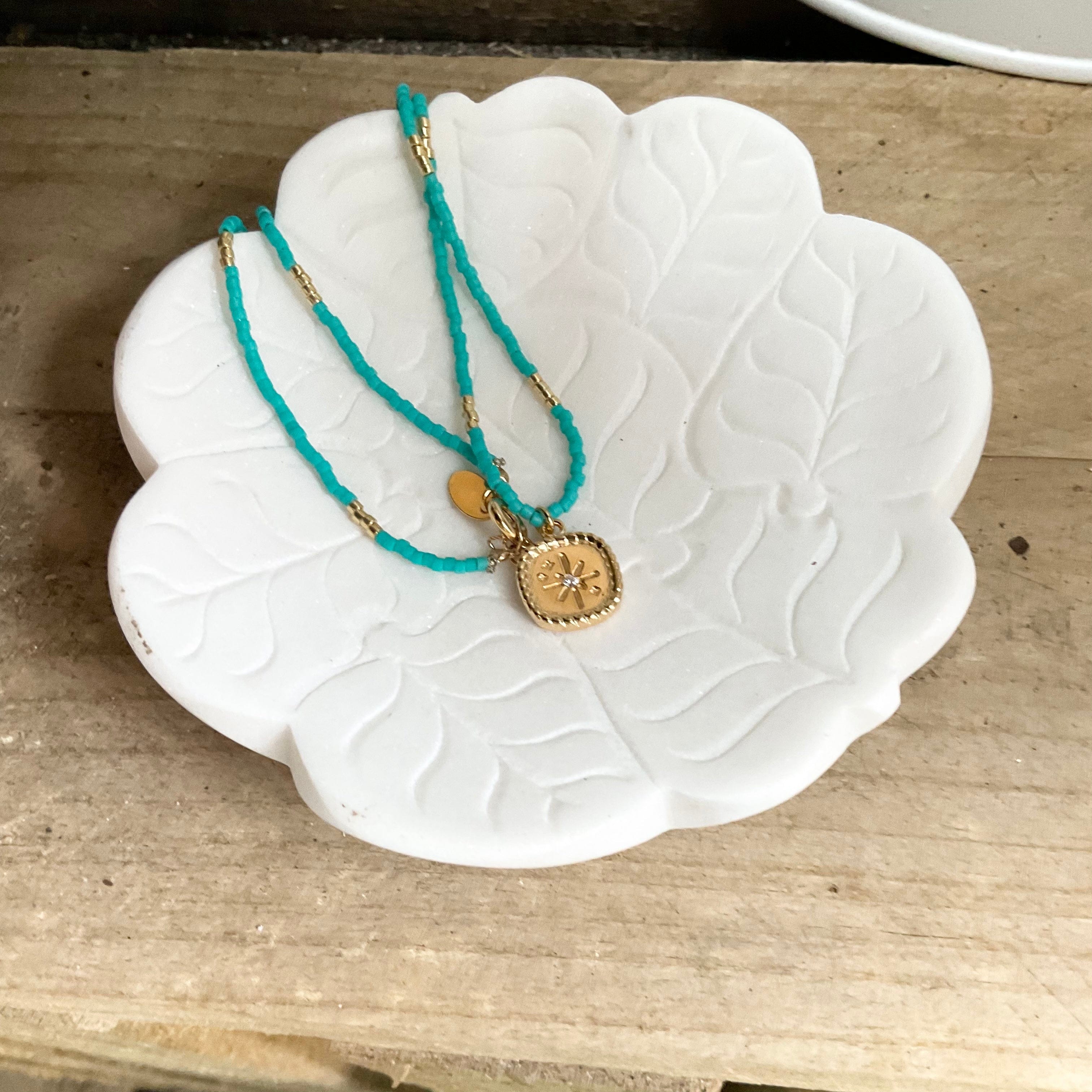 Gorgeous beaded necklace from Paris with engraved pendant.