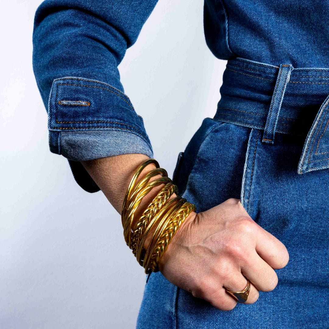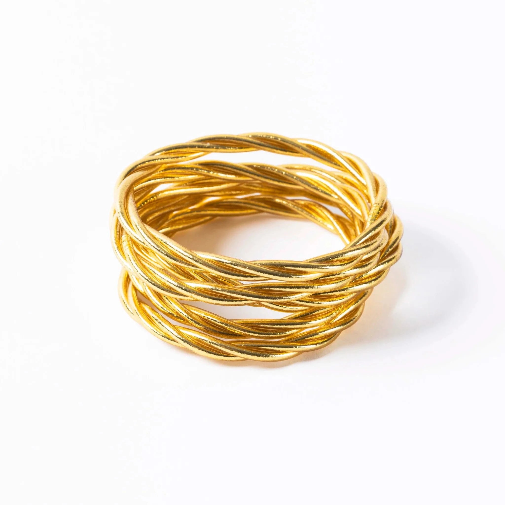 The bracelets are made from transparent flexible rods filled with gold leaf.