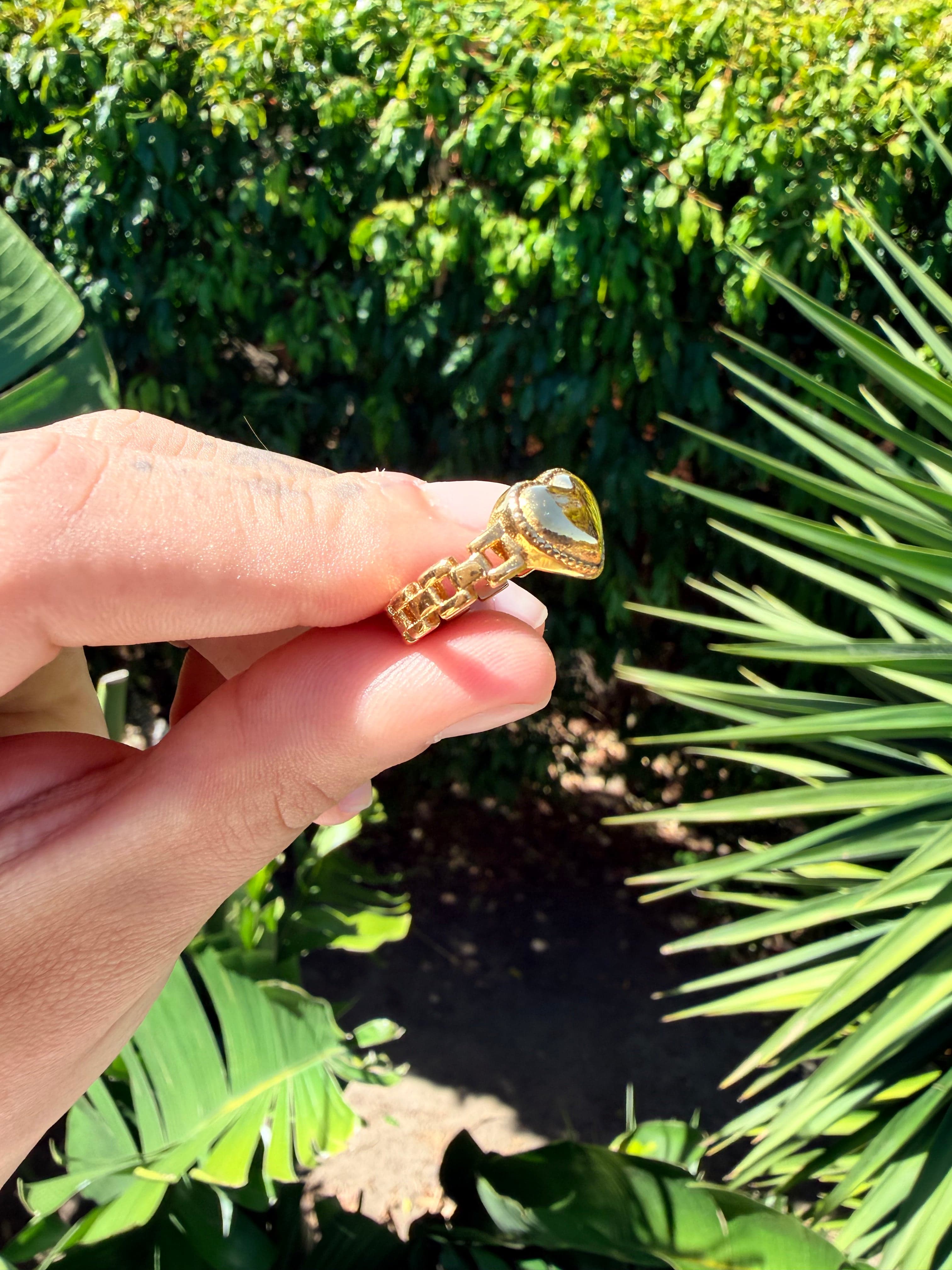 The More Love Ring features a softly sculpted gold band crowned with a luminous heart-shaped stone, framed in an organic, textured setting that feels both timeless and soulful. Designed to be worn as a daily talisman, it carries a quiet message of compassion, self-love, and openness.