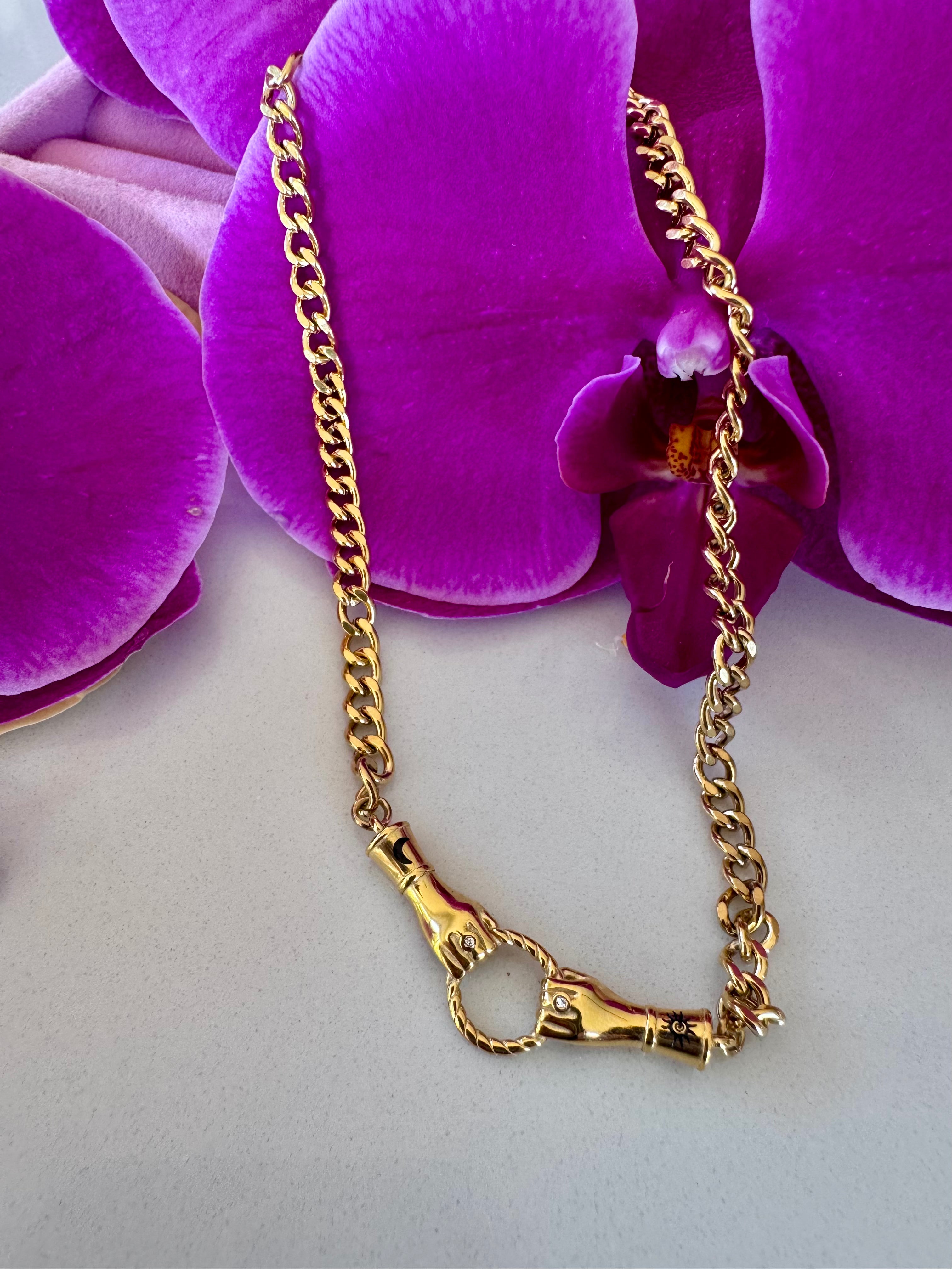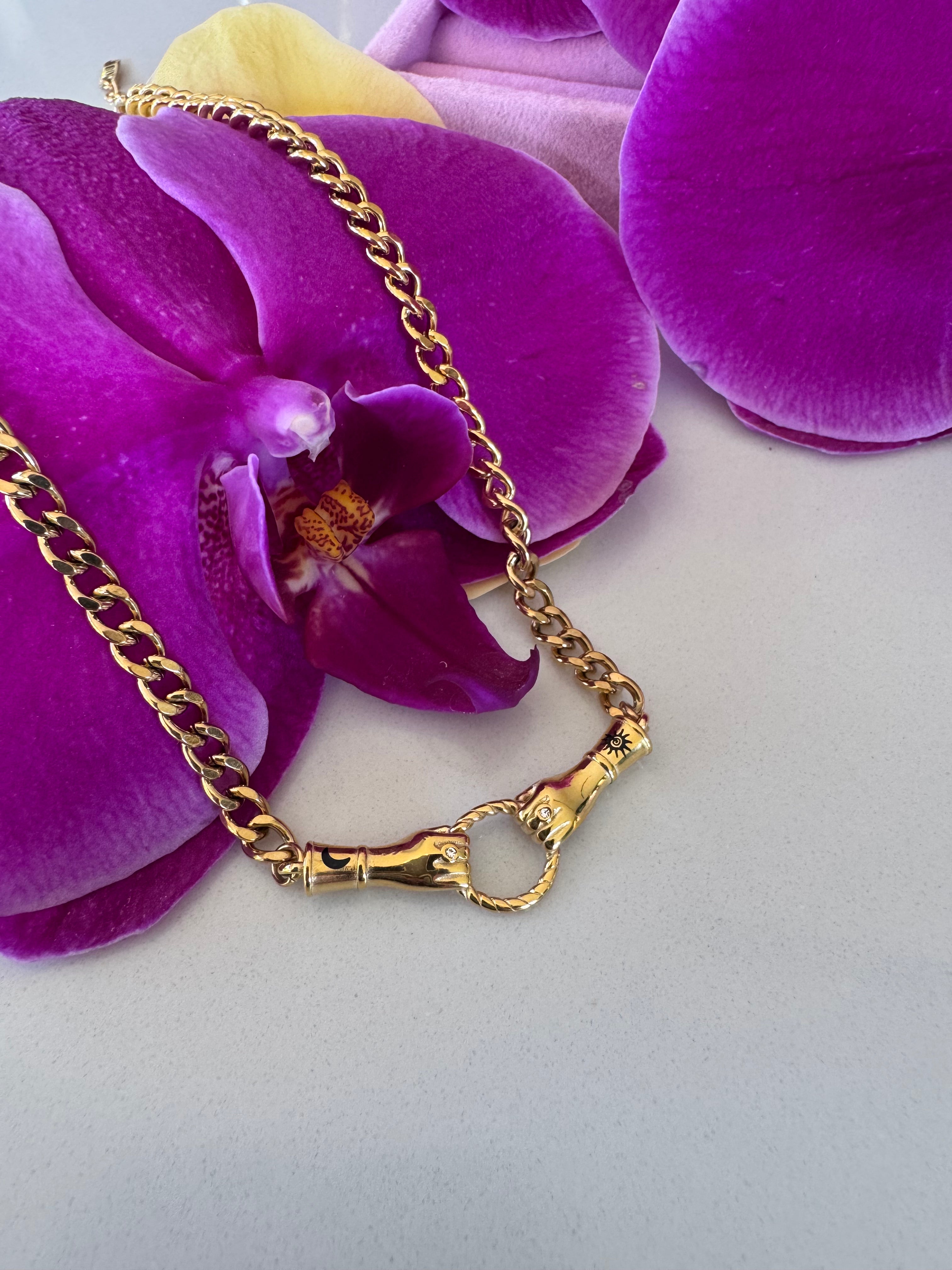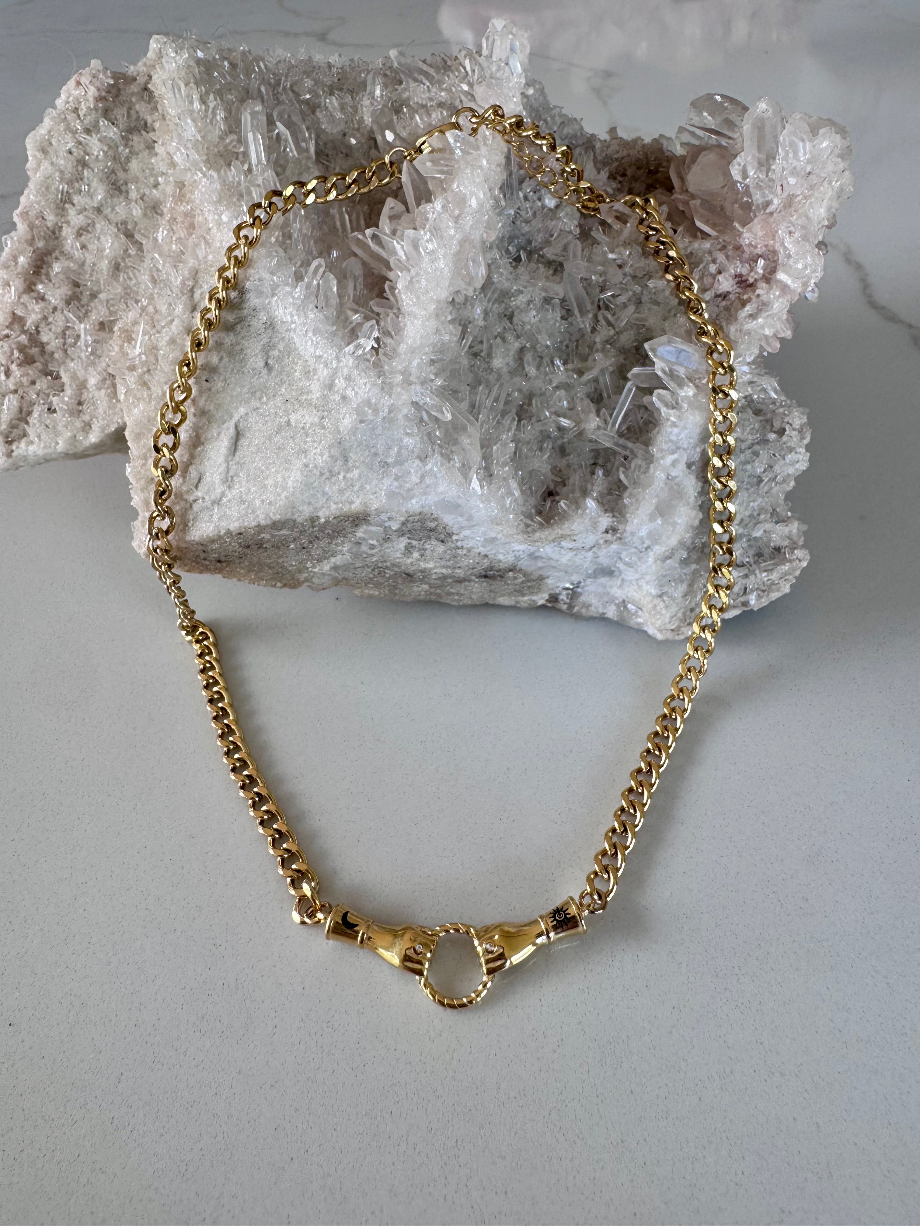 The Golden Bond Necklace features a bold gold chain finished with a sculptural clasp detail — designed to be seen, felt and worn with intention. Strong yet refined, it represents the ties we carry within us: to ourselves, to others, and to the moments that shape us.